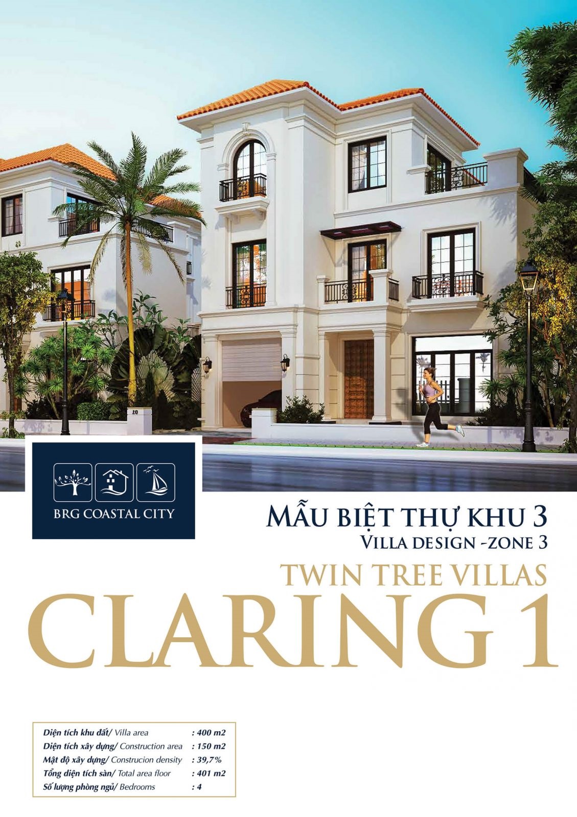 Khu Biệt thự Claring 1 tại dự án BRG Coastal City Đồ Sơn nằm tại phân khu 3 của dự án với phong cách thiết kế tân cổ điển sang trọng trên khu đất rộng 400m2 gồm 3 tầng và 4 phòng ngủ.