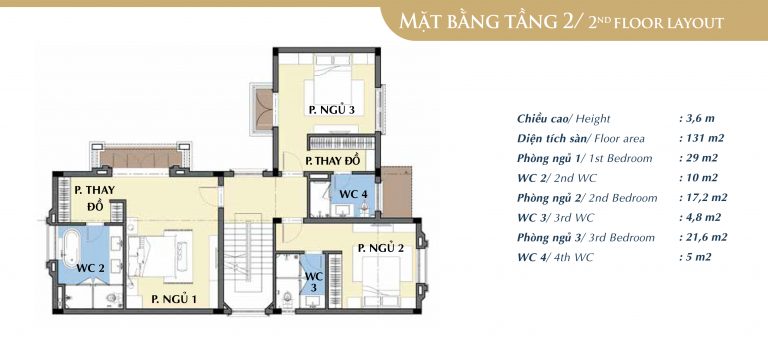 Tầng 2 được thiết kế với 3 phòng ngủ lớn, trong đó có 1 phòng ngủ Master có bồn tắm riêng.