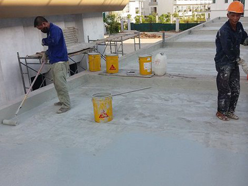 Đầu tiên tạo một lớp vữa mỏng quét lên bề mặt sàn bê tông để lấp kín những vết rạn nứt của sân thượng. Sử dụng vữa Sikatop Seal 107 hoặc Sika Latex để quét. Đối với loại vữa Sikatop Seal 107 thì chúng ta pha trộn và tiến hành quét lên bề mặt sàn bê tông 2 lớp. Đối với vữa Sika Latex chúng ta trộn theo tỷ lệ: 1 lít Sika Latex + 1 lít nước sạch + 4 Kg xi măng trộn đều với nhau sau đó cũng quét 2 lớp lên bề mặt bê tông, đợi lớp đầu tiên khô sau đó mới quét lớp thứ 2, mỗi lớp cách nhau từ 1 – 2 giờ đồng hồ.