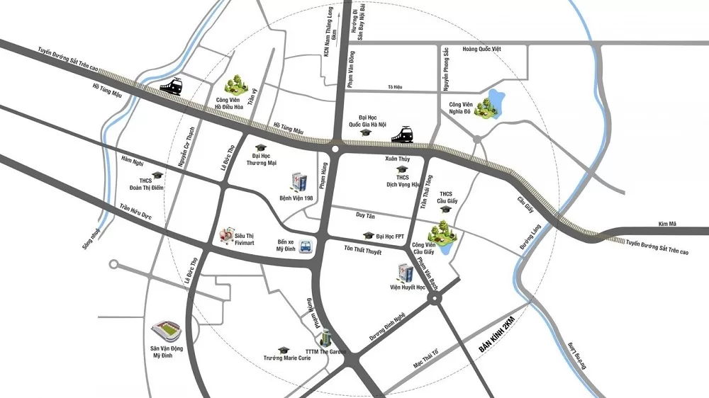 – Trung tâm thể thao Mỹ Đình: Khu liên hợp thể thao quốc gia cùng hạ tầng hiện đại đi kèm, kết nối qua đường Mễ Trì, Lê Đức Thọ (3km)